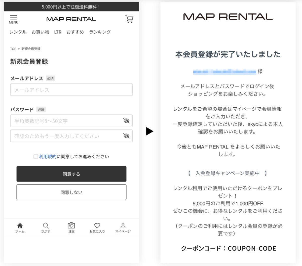 MAP RENTALでは、新規会員登録の特典として1,000円OFFのクーポンがもらえます。