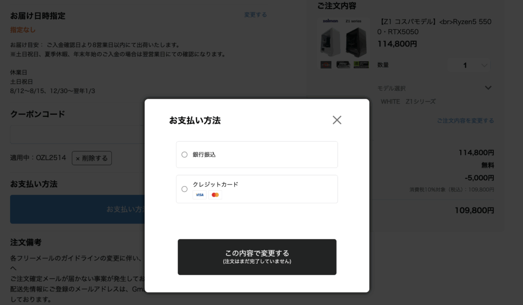 - 利用場所:OZ GAMING公式オンラインストアの注文画面