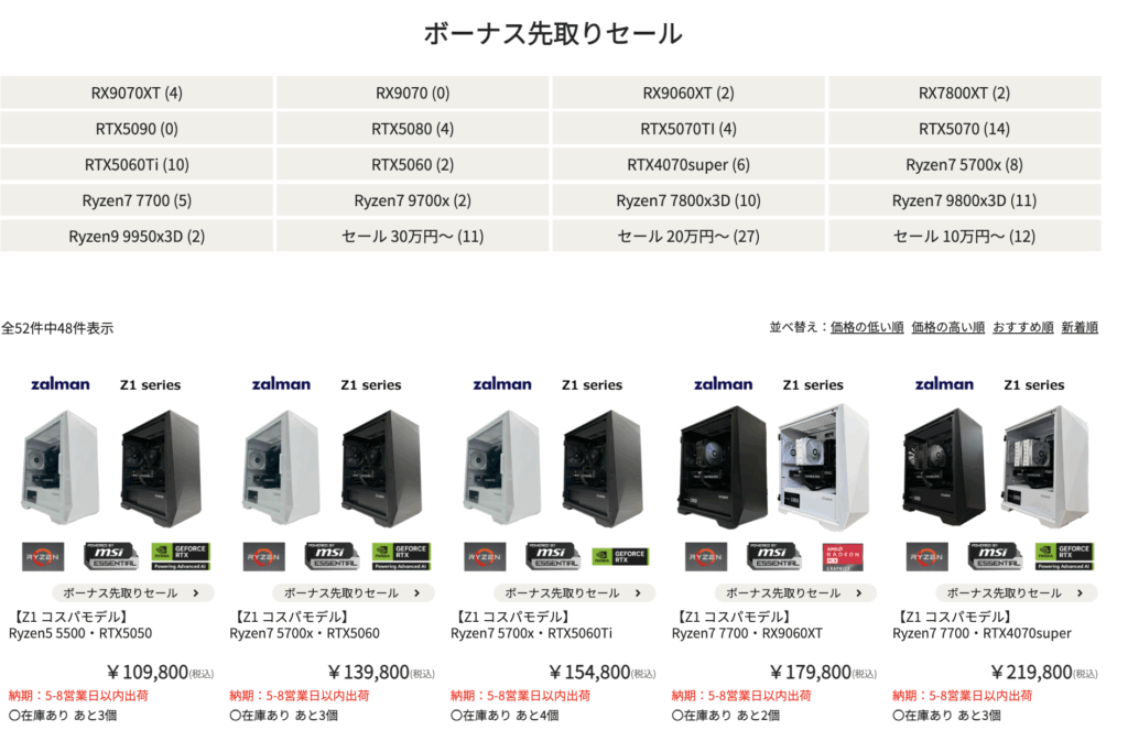 CPU・GPUの組み合わせや、10万円台・20万円台・30万円台といった価格帯別のセールカテゴリが細かく用意されているため、