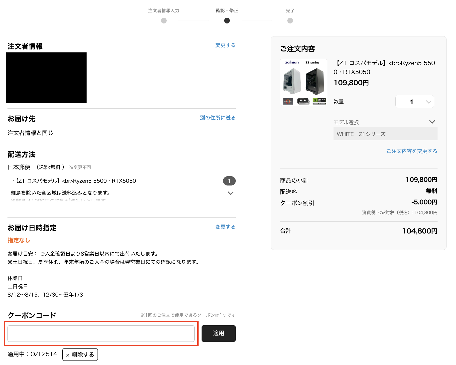 STEP4:注文内容確認画面でクーポンコード「OZL2514」を入力