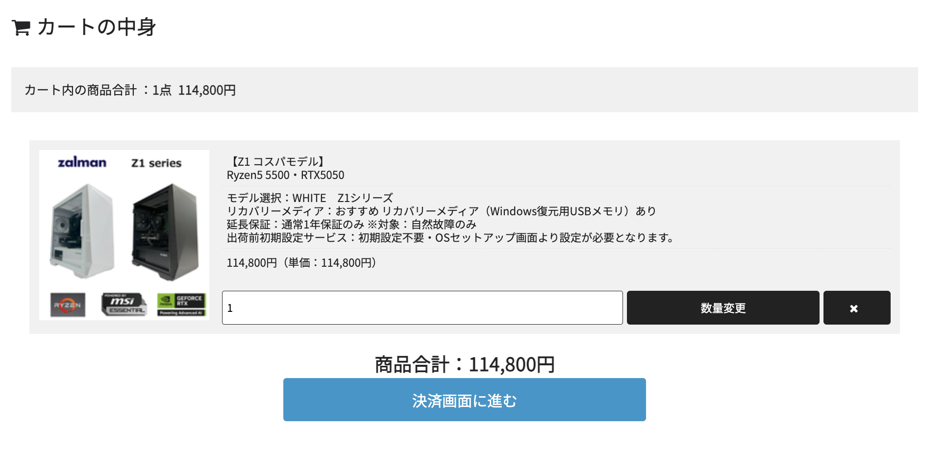 カート画面では、選択したパーツ構成・本体価格・合計金額が表示されます。