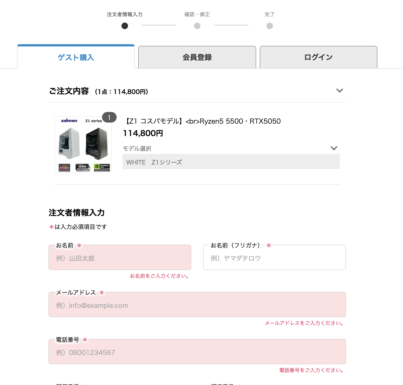 内容に問題がなければ、「決済画面に進む」ボタンを押して注文者情報の入力画面へ進みます。