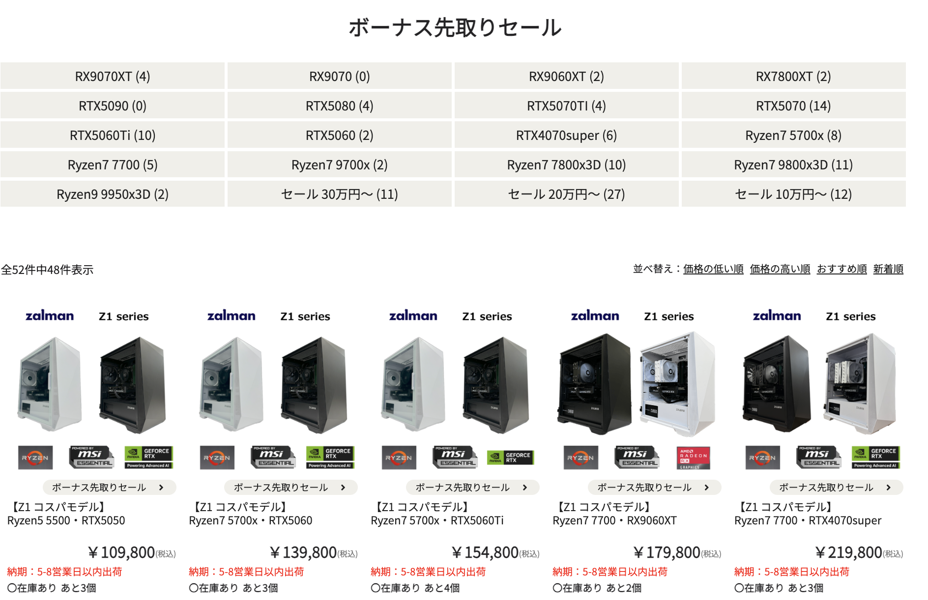 例えば、ボーナス先取りセール対象のRyzen 7+ミドルハイクラスGPUモデルが