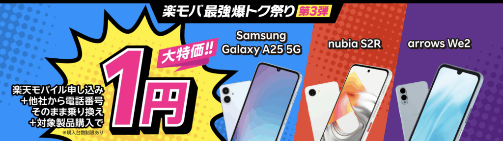 Samsung Galaxy A25 5G、nubia S2R、arrows We2 が1円で購入できるキャンペーンです。