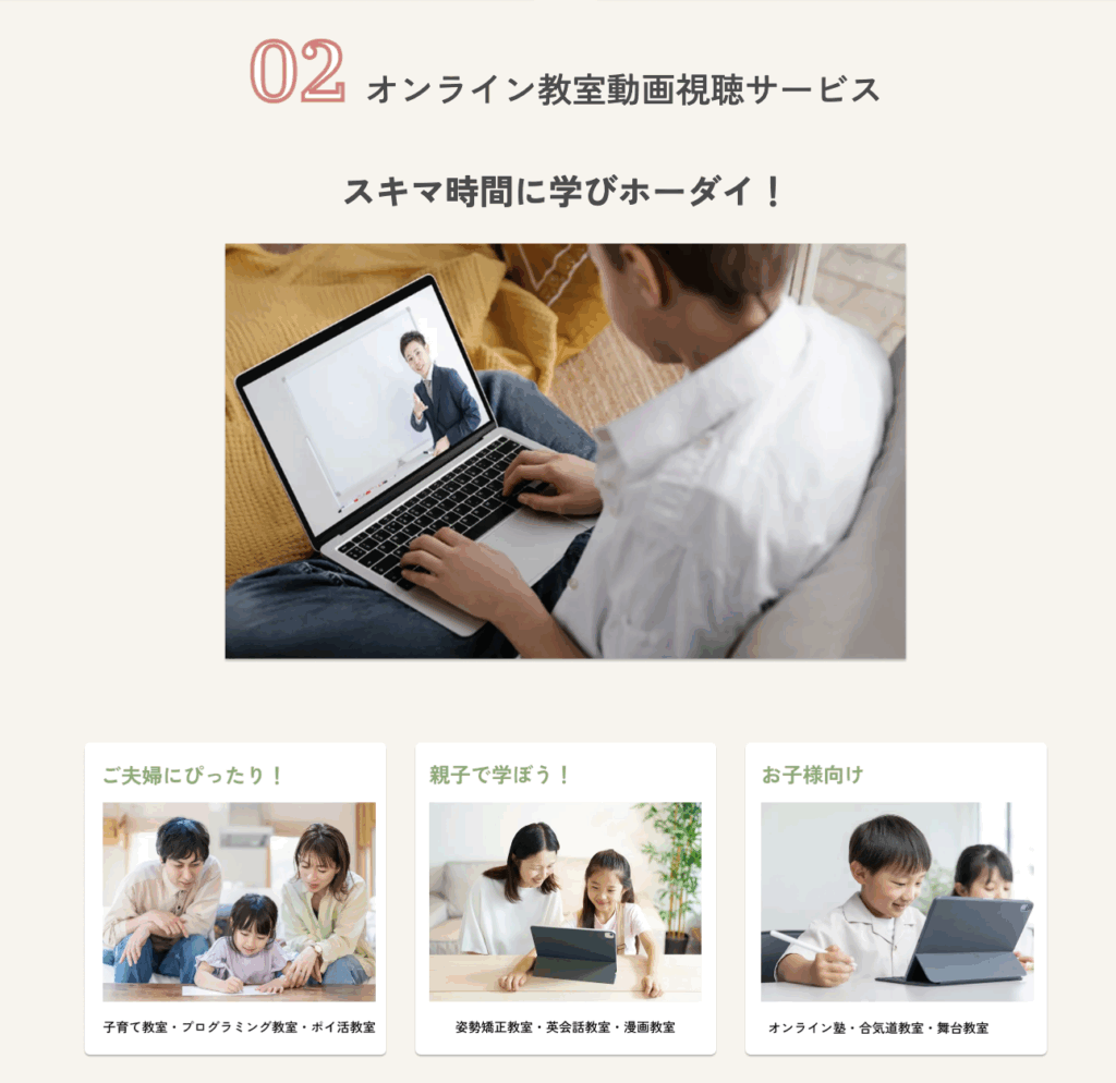 パソコンやスマホで、子どもから大人まで学べる多彩なオンライン教室を提供。スキマ時間でスキルアップできます。
