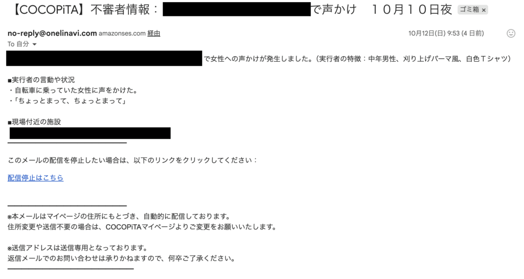 上の画像のように不審者情報の通知が来て気をつけることができます。