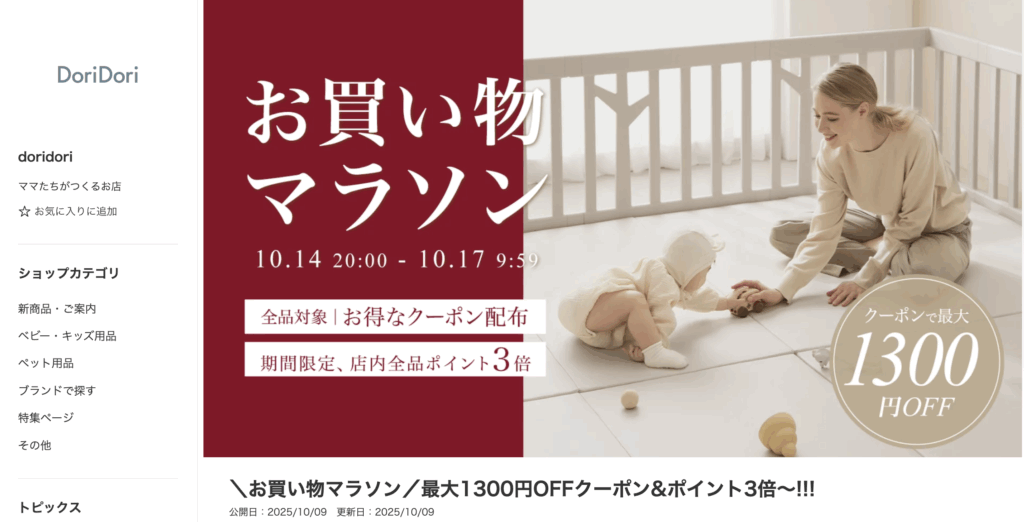 2025年10月14日、楽天市場のDoriDori公式ショップで期間限定クーポンが配布されました。詳細ページは以下です: