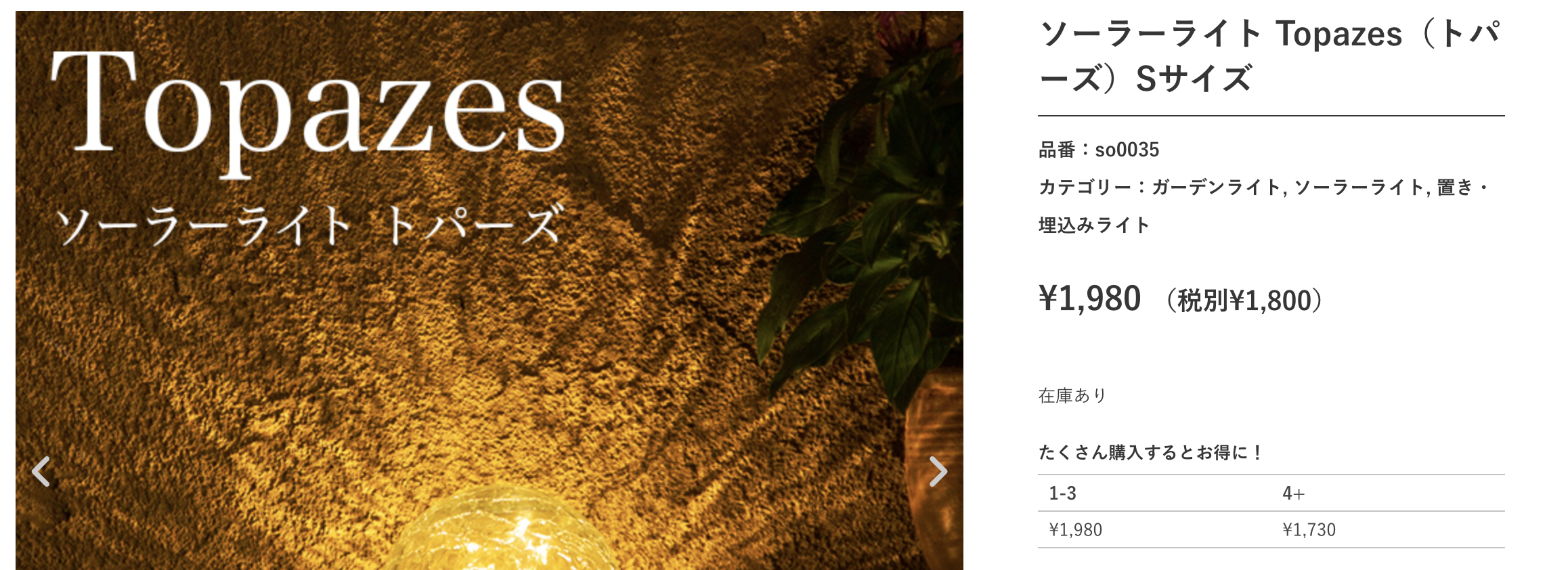 例として、公式商品ページ「ソーラーライト Topazes(トパーズ)Sサイズ