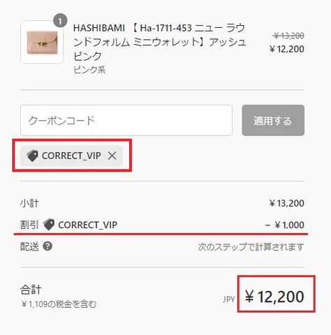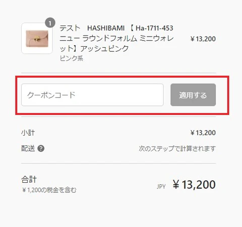 チェックアウトページ内の【クーポンコード】欄にコードを入力し、「適用する」を押下します。