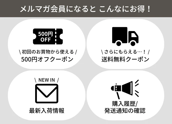 HASHIBAMIのメルマガでは、新作情報やセール開始のお知らせとともに、初回の買い物から使用できる500円オフのクーポンがもらえます。